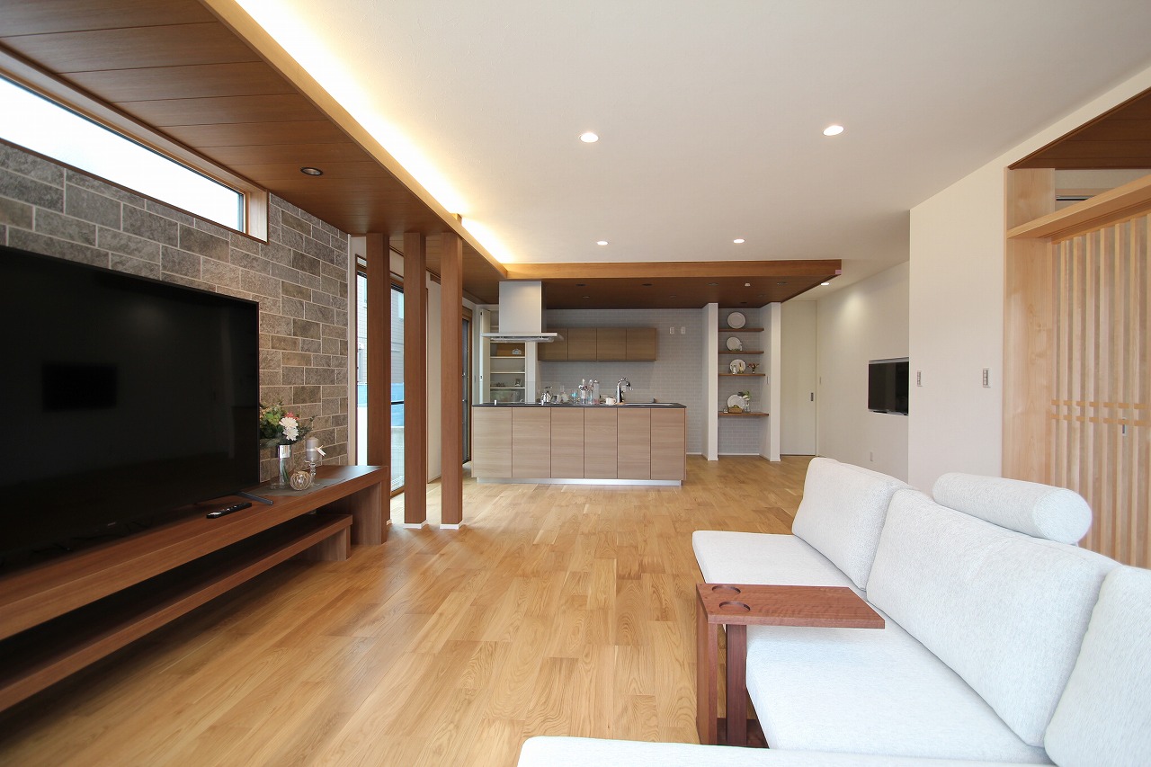 キッチンを折り下げ天井にすることで間仕切りや壁がなくても、空間の区切りを演出できます。